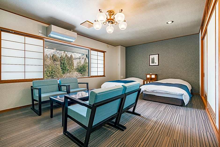 The spacious air-conditioned twin room provides a flat-screen TV, tatami, a wardrobe, a safe deposit box as well as mountain views. The unit offers 2 beds.